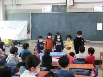 今日はクリスマスで、お楽しみ会が開かれました。グループごとに用意した出し物(なぞなぞ、お笑い、マジックなど)を披露しました。話題の「鬼滅の刃」に出てくるねずこが入っている入れ物まで用意していてびっくりしました。