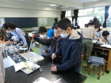 理科は「もののとけ方」の学習です。一定量の水に食塩とみょうばんがどれくらい溶けるかを実験で調べます。ここでメスシリンダーが登場します。実際にメスシリンダーを触って、量って、やり方を確かめながら、実験を進めました。楽しく実験を進めていました。