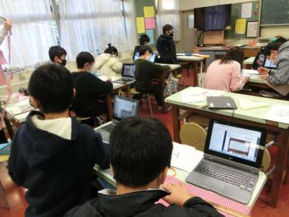 家庭科は、「ブックカバー作り」です。ロイロノートを使って、作業の手順を確認しながら、型紙を使って布に線を引きました。布の柄は自分で選んびました。丁寧に作業を進めています。出来上がりが楽しみです。