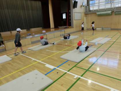 体育館では「とび箱あそび、マットあそび」が続いています。体育館1周コースは前回とは違います。バーをくぐったり、マットも開脚まわりが入ったり、とび箱は2回跳んだりします。音楽が流れる中、楽しく運動しています。