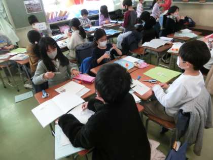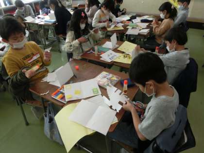 図工は「どきどきカード」作りに取り組んでいます。カードは「うごかせるカード」「とびだすカード」があり、今日は練習で作ってみました。お手本を見ながら、どうやって作るのかを確認し、切って、カードに貼って、試して意欲的に進めています。学習発表会で朗読する詩をもとにカードを作っているそうです。完成が楽しみですね。