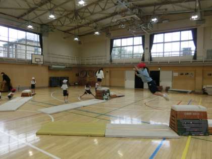 体育は体育館で「とび箱あそび」です。とび箱の上にのぼってジャンプして着地します。遠くまでジャンプ、回ってジャンプ、後ろ向きでジャンプ。工夫しながらかっこよく跳んでいます。