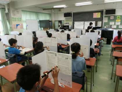 音楽では「エーデルワイス」をリコーダーで吹きました。上のパートと下のパートに分けて練習しています。この後、音の重なりを意識しながら、合わせて吹いていく予定です。