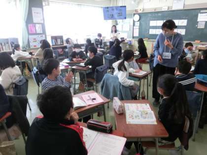 今日はサンディ先生との最後の授業でした。「自分の日課を伝えよう」というねらいで、「顔洗う」「学校に行く」「宿題を終わらせる」など、1日の日課を時間も入れて話してみました。