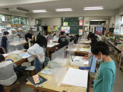 図工は「歯と歯茎の健康ポスター」づくりに取り組んでいます。大きくうっすらと下書きを書いたあと、丁寧に広い面から塗っていきます。絵の構成が楽しく、みんなの個性が光っていました。色の塗り方もとても丁寧です。