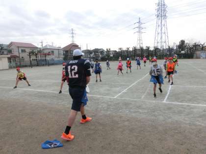 体育はフラッグフットボールの学習です。担任がアメリカンフットボールの経験者で、ユニフォームを着て授業をしています。子供たちも気分にのって、守り方や攻め方を考えながら、ゲームの進め方を理解しました。