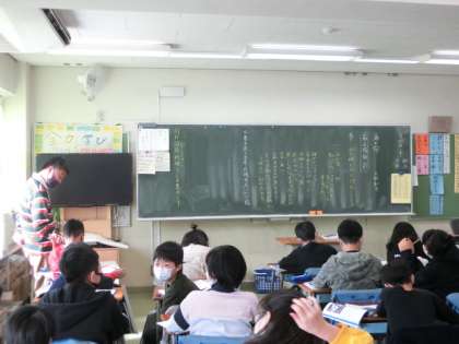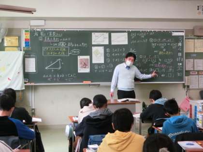 算数は巻末の「算数ワールド」の学習です。今日は直角三角形のひみつで、ピタゴラスの定理について学びました。担任が丁寧にやり方を説明してくれるので、子供たちは求め方をよく分かっていました。詳しくは中学校で学習をします。