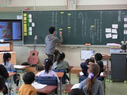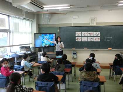 英語はサンディ先生との最後の授業です。今日はお話に出てくる動物の名前の言い方と、その鳴き声を覚えました。日本語と英語では、動物の泣き方も違います。動物になりきって、みんなで楽しく英語に親しみました。