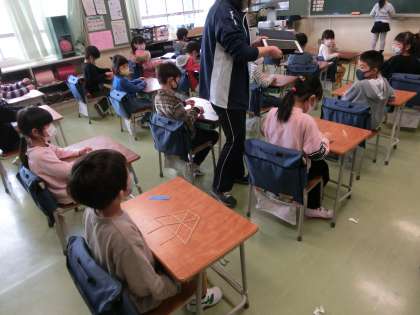 算数は「かたちづくり」です。棒で三角や四角をつくり、組み合わせていろいろな形を考えました。ロボットやねこ、模様などいろいろです。先生がタブレットで、一人一人、できた形の写真を撮り、大型テレビで紹介してくれました。