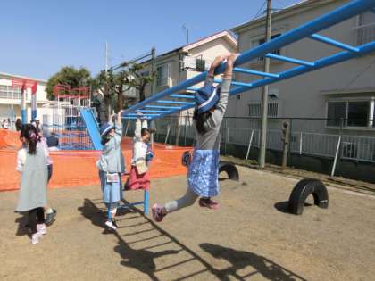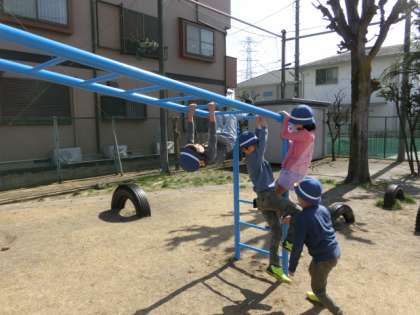 昨日はうんていをきれいにしました。ペンキがもう乾いたようで、今日から早速、遊ぶことができています。「わぁ、きれいになった」「スカイブルーだ」きれいになったうんていで気持ちよく遊んでいます。