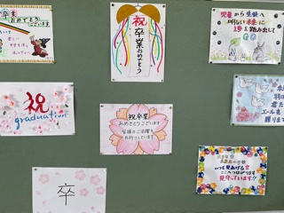 6年生の教室前の掲示板には、地域の方からのお祝いメッセージが貼られています。昨年度に引き続き今年度の卒業式も、コロナウイルス感染症対策として密にならない環境をつくるために、ご来賓の参列は、ご遠慮いただきました。その代わりに、地域の方からの温かいお言葉をいただいております。ありがとうございました。
