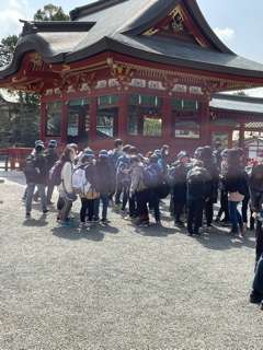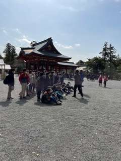 バスで鎌倉まで来ました。初めは、鶴岡八幡宮でクラスごとに写真を撮りました。