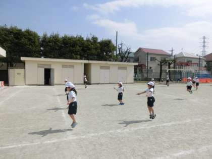 体育はなわとびやボール転がしゲームをしました。校庭では桜の花が咲き始めました。気候もよく、気持ちよく楽しく運動しています。