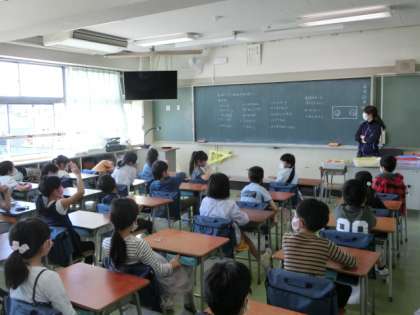 算数は「時刻と時間」の学習です。まずは時計を正確に読んで、時刻を確実に答えられるようになること。つぎに、時刻と時刻の間の計算ができるようになること。2年生にとって、とても難しい学習です。先生の指導のもと、丁寧にノートに書いています。くり返し練習して、しっかりとできるようにしたいですね。