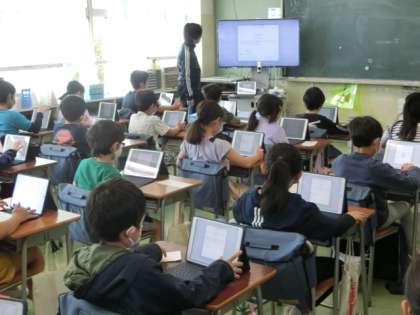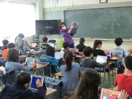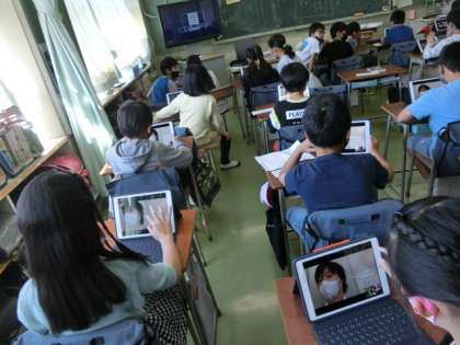 自分たちのタブレットを使って、Zoomのつなげ方と使い方を学びました。先生の指示のもと、手順通りに進めていきます。IDとパスワードを入れると自分たちの顔が写り、ほっと一息。Zoomへのアクセス成功です。さらに画面を切り替えると、学年のみんなの顔が並んで、大喜びでした。今後もこのZoomを積極的に活用していきます。