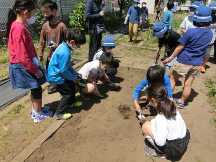 理科はヘチマの種植えです。「ヘチマの種はどのような形ですか?」「ヒマワリの種に似ている」「ヒマワリの種は白と黒のしましまだけど、茶色だよ」子供たちは比較しながら、よく観察しています。