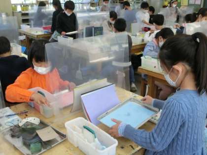図工は「絵の具のぼうけん」です。テーマを決め、画用紙を選んで、スポンジやブラシ、ビー玉などを使って好きなように絵を描きます。色使いや道具の選び方など、一人一人、それぞれ違って、とても素敵です。目を輝かせて取り組んでいました。