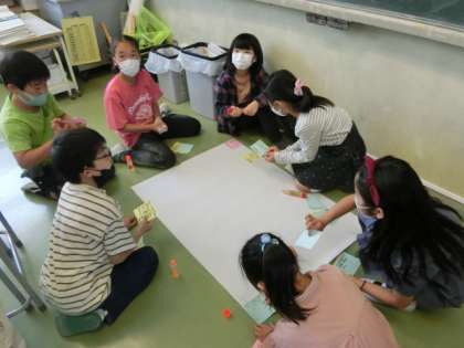 学級会では「学級スローガンを立てよう」ということで、クラスで話し合いました。「みんなが元気よく楽しむクラス」「くじけずに助け合いながら挑戦クラス」「一人一人が個性にあふれて、みんなが笑顔になるクラス」など。みんなの意見は付箋紙に書かれ、模造紙にまとめられています。