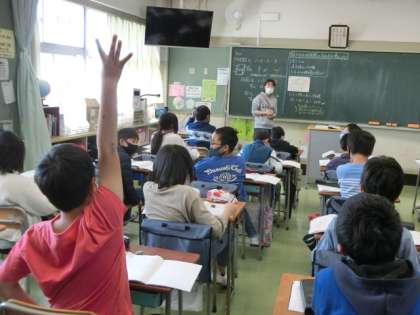 算数の学習は「体積」です。いろいろな形の体積を求めたり、厚みのある容器の体積を求めたりしました。算数は習熟度別に4つのクラスに分かれて授業を進めています。ただ答えを出すだけでなく、いろいろな体積の求め方を考える授業がどのクラスでも展開されていました。