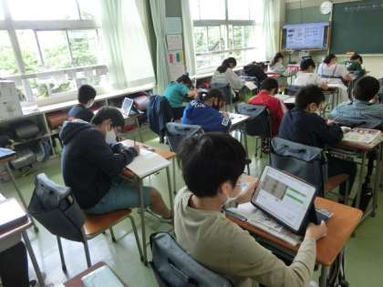 社会は「国の政治のしくみと選挙」の学習です。教科書が変わって、政治の学習が1学期になりました。今日は1組が国会の働きについて学びました。「政党って何かわかりますか?」の先生の質問に、知っている児童がちらほらと。与党と野党という言葉を初めて知った子も多かったです。ニュースや新聞を見て、学びを深められるといいですね。3組は教科書や資料集だけでなく、ロイロノートで先生が配布した資料を使って、「国民主権」について学習を進めていました。