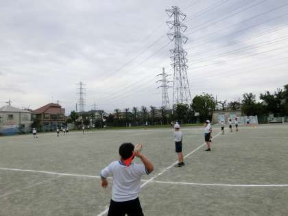 体育はミニハードルを使ったハードル走と、ジャベボールというロケットの形をした道具と使って、投げる練習を行いました。クラスを半分に分けて行っているので、活動する時間が十分にあります。男子は特にジャベボールを使って、投げる練習を楽しんでいました。