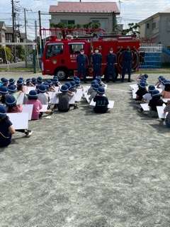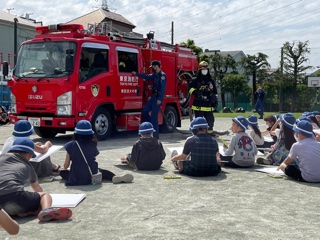 消防服に着替えた消防士さんを見て、「かっこいい。」「暑くないのかな。」「どうやったら消防士さんになれるのかな。」など、消防服に興味があるようでした。