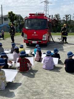 その後、子供たちは、それぞれ描きたいところを見つけて、大きな画用紙にクレヨンで消防車を描きました。短い時間でしたが、画用紙いっぱいに赤い消防車や消防士さんを描いていました。