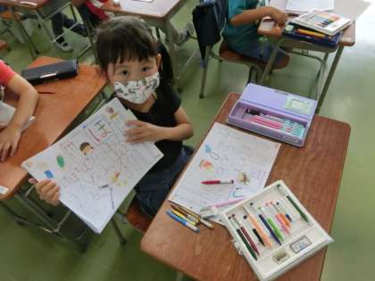 図工は「あじさいをつくろう」です。いろいろな色の小さな折り紙を先生が用意してくれました。好きな色を選んで、花を切り取ります。あじさいの花一つをとっても個性がよく出ています。はさみの使い方が上手でした。
