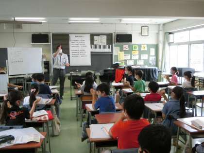音楽は「6拍子を感じながら歌いましょう」というねらいで「風のメロディー」という曲にチャレンジしました。「風のメロディー」の8分の6拍子とはどんなリズムか、手拍子で合わせながらみんなで何度も確認をしました。難しいですね。