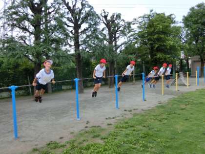 体育は長縄跳びにチャレンジです。タイミングを合わせながら、少しずつ上手に跳べるようになりました。授業の最後に鉄棒もしました。きれいに「つばめ」「ふとんほし」「前まわり」そして「逆上がり」までできる子が多くて驚きました。