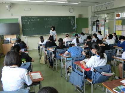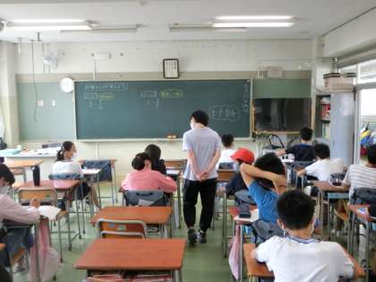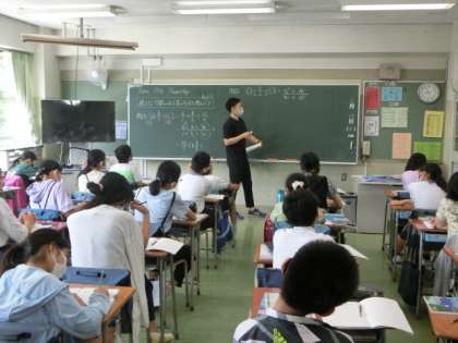 算数は「分数のわり算」です。今日は整数や小数、分数が混ざった計算練習をしました。とても難しい計算です。習熟度別に分かれ、一つ一つ、基本的な計算の仕方を確認しているクラス、練習問題に取り組んでいるクラス、さらに違った計算のやり方を模索しているクラスと、それぞれにあったやり方で進めているので、意欲的に取り組んでいます。