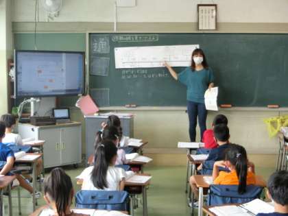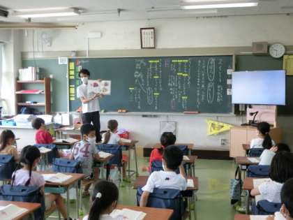 国語は「スイミー」の学習の続きです。1組も登場人物について詳しく考えていました。「ゼリーってどんなもの?」→「プルプル」「プリンににている」「スプーンですぐとれる」「こんにゃくみたい」など。「ブルドーザーは?」→「土をはこぶ」「はたらく車」「土をもちあげる」など。一つ一つ言葉を確認していくと、楽しいですね。
