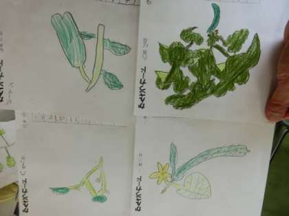 生活科では野菜を育てています。今日は観察カードを書きました。「きゅうり」「ピーマン」「すいか」「なす」「ミニトマト」・・・、絵を見ると、とても順調に育っているようです。早く食べられるといいですね。