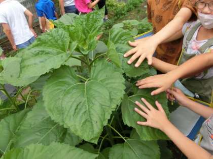 理科は教材園で育てているヒマワリを観察しました。葉っぱの大きさは「手を広げた大きさよりも大きい」、茎の太さは「腕のほうがまだ太いかな」、背丈は紙テープで長さを調べました。もっとぐんぐん伸びるのかな?