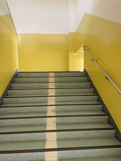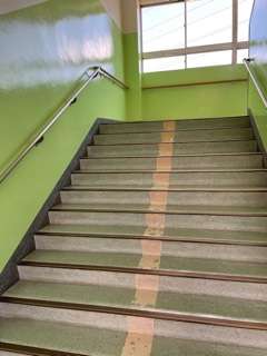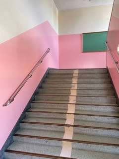 階段の壁の色塗りが終わりました。階段の色は、東階段がピンク、中央階段が黄色、西階段が緑になりました。明るく素敵な学校の階段になりました。皆さんの教室に行く階段は、何色階段ですか。