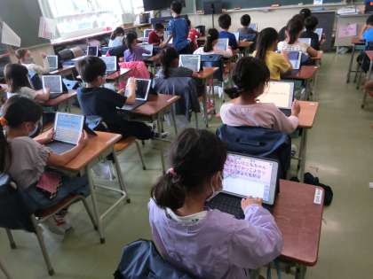 教室に戻ったら、ロイロノートで、5年生の演技を見た感想を交流しました。「れつがそれっていてすごかったです」「おどりにきれがあって、かっこよかったです」など、5年生の良さをたくさん探していました。
