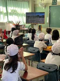校庭で見ている子供たちも、教室のテレビで見ている子供たちも、一緒に応援しています。