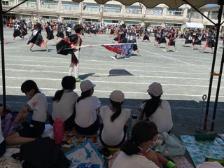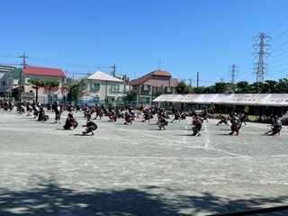 自分たちで作ったおそろいのはっぴを着て力強く踊りました。「ヤー!」というかけ声が青空に響いていました。