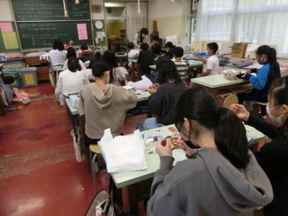 家庭科は「マフラー」の製作です。今日は前回作製したワッペンをマフラーにつけました。糸の色や縫い方を工夫して、集中して取り組んでいました。展覧会で展示されるようです。仕上がりが楽しみです。
