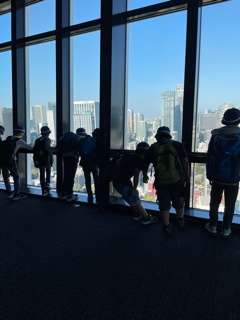 展望台に着くと、360度が見えるガラス窓から方角を確認して、東京の街並みを見ました。今日はお天気がよかったので、横浜のビルやスカイツリー、そして富士山がうっすらと見えました。