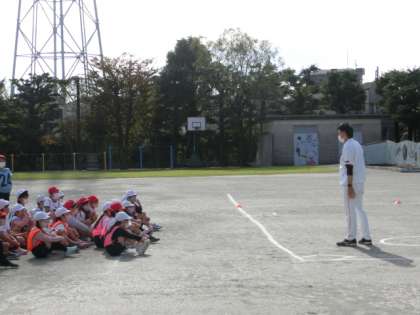 ジャイアンツアカデミーのコーチ、北之園さんや、NPBの野球振興室の水上さん、石附さんに来て頂き、クラスごとに体育の「ティーボール」につながる授業をして頂きました。
