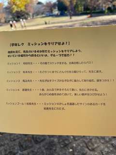 初めは、学年レクです。グループで4つのミッションにチャレンジします。グループで協力して、ミッションをクリアしましょう!