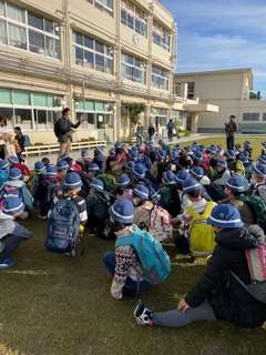 今日は、3年生の社会科見学です。校庭で見学の仕方やバスの乗り方について確認しました。