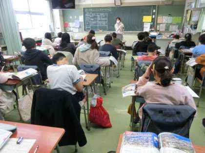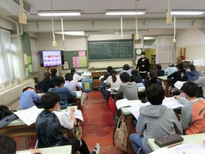 家庭科は「持続可能な暮らし」という学習です。買い物(服)の情報を集め、買い方の手順について考えました。素材については、自分の着ている服のタグを見ながら、考えていました。今日の学習が日頃の生活に生きてくると思います。