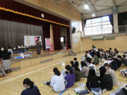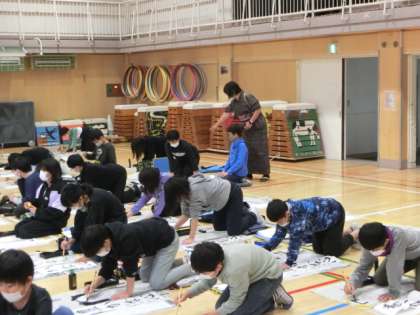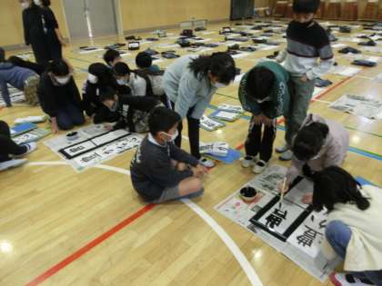 鈴木先生をお呼びして、書道の授業を体育館で行いました。5年生は書き初めで「豊かな心」を書きます。ただ書くだけでなく、「リレー書道」にチャレンジしました。はじめに先生が文字のポイントを教えてくれました。それをもとにグループで力を合わせて書き上げます。チームワークよく協力して書き上げ、完成すると自然と拍手が上がりました。