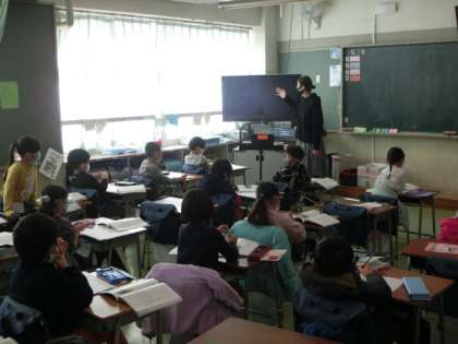 国語は「たぬきの糸車」という物語文の学習です。場面ごとに大事な言葉を探しながら進めています。『目をまわすたぬきを見て「いたずらもんだが かわいいな」というおかみさんの言葉をどのように読めばいいでしょうか?』→「楽しく」「小さな声で」「たぬきがにげないように、糸車に集中しながら」など。大事な言葉から、想像して文章を読むとさらに理解が深まります。