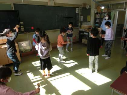 生活科は「冬の遊びを楽しもう」で、今日はけん玉をしました。初めてする子も多かったようです。上手な子の様子を見ながら、何度も挑戦していました。