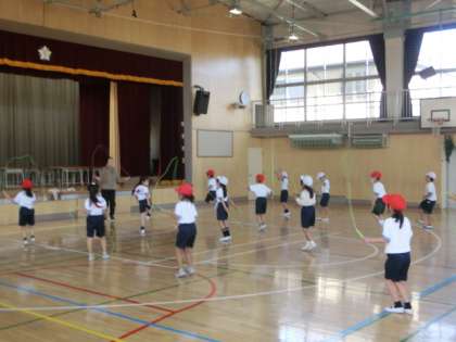 体育はなわとびの授業です。音楽が流れる中、リズムよく先生と一緒に楽しく跳びました。