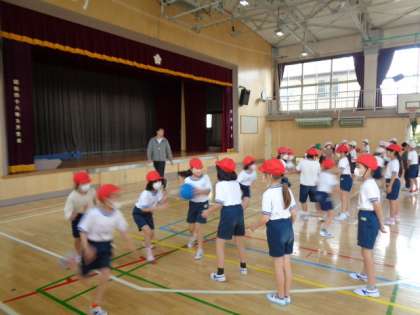 体育は「からだほぐしの運動」です。みんなで協力しながら、ボール運びリレーに挑戦です。「はい、どうぞ」とかけ声をかけながら、協力して進めていました。