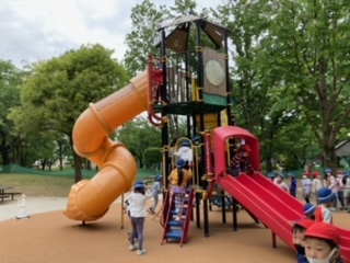 公園では、噴水前で集合写真を撮り、その後アスレチックで友達とたくさん遊びました。これからは、まちにまったお弁当の時間です。